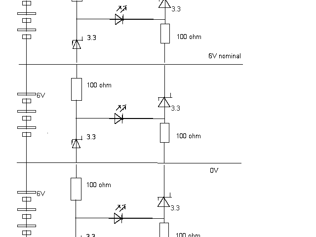 Here’s the circuit. It has two potential dividers using 3.3V Zener diodes and 100 ohm resistors and an LED between them This gives you two reference points, one 3.3V above the battery negative, one 3.3V below the battery positive. The difference between these is the sag from 6.6V. When the battery is at 6.3V it means that there will be 0.3V across the LED. Not enough to light it up. When the battery is busy and at 5V there will be 1.6V across the LED. that’s bright light! There are sixteen of these circuits (click on the diagram), one for each battery.