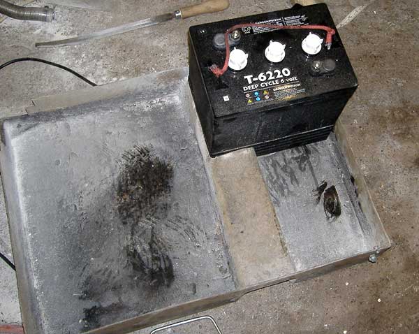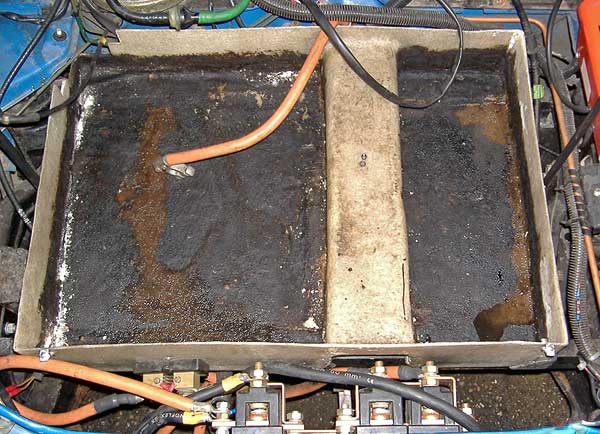 This is how the battery tray looked when they started off. To accomadate the transmission “bump” the original designer put a channel in the battery box. Clever.