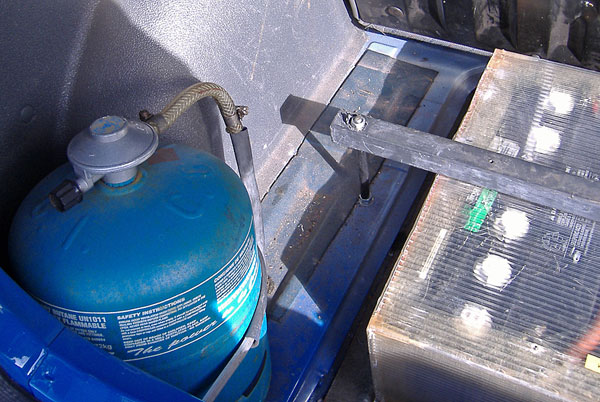 First off the EV currently has a propane heater. Here you can see the small propane tank nestled in with some of the batteries. (click thumbnails for larger images)