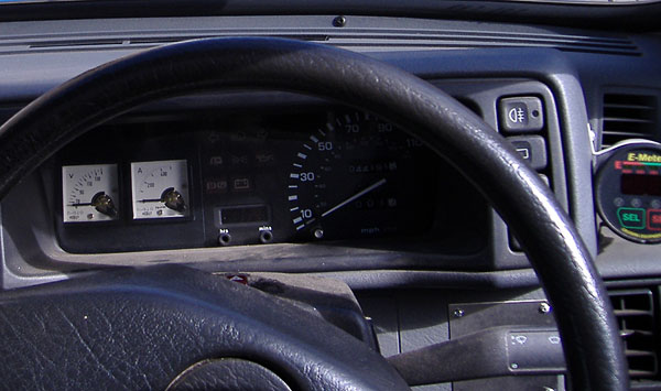 Here’s a view of the dash. I’ll forego the “it’s on the wrong side!” jokes for now. In the instrument cluster are a couple nice, analog meters: voltage and current. Off on the right is an E-meter.