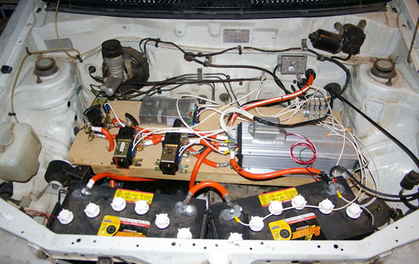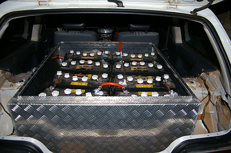 “Battery box was made by my neighbor who is a steel fabricator/sheet metal worker. It’s made out of aluminum of cuts and took him about an hour to bend and weld up while I fixed his office network. It will have an aluminum lid once he gets around to making it for me. It’s not hard IF you know how to weld aluminum. Being aluminum I have to coat it with an acid proof paint or give it a rubber lining to get to pass the licensing inspection. Underneath it is a steel frame to give it support which will be bolted to the floor of the car. I’ll take a picture of that when I remove the batteries to bolt everything in. At the moment they are just sitting there and everything tends to want to join me in the front seat when I stop.”