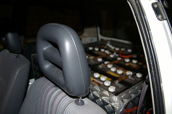 And now for the big challenge: where do you put a thousand pounds of batteries in a small car like this? John got two of them up front with the motor and electronics and the other eight are now “passengers” in the back seat and trunk. I really like the battery box and asked John about it: