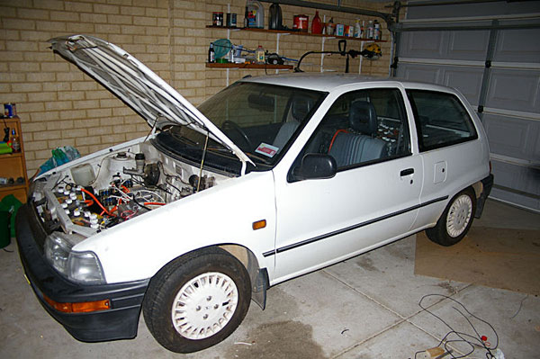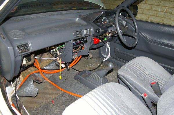 John is one of the growing number of EV owners in Australia. He runs the website EV Australia (link at end of article) and has been providing useful feedback on this site via comments for some time now. He is putting the wraps on his current EV conversion, based on a two seater Daihatsu Charade (it wasn’t always a two seater: he removed the back seats for batteries).