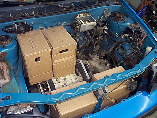 FYI, a pic: showing the potbox installed on the firewall, throttle cable connected. And we’ve been playing around with battery mockups for placement purposes. Probably 4 up front, 4 in the hatchback for a 48v system.