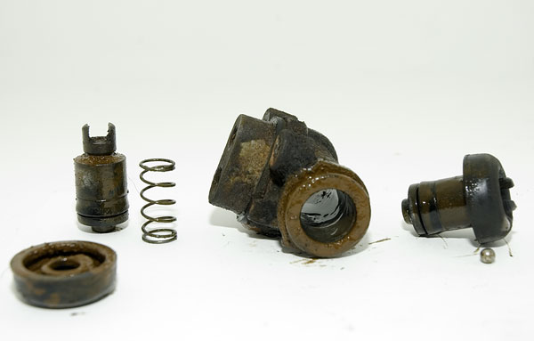 This is the rear drum brake hydraulic wheel cylinder. When I popped off the rubber boots to inspect them I was surprised to find an oily, rusty mixture oozing out.