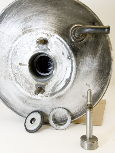 As you can see I took it apart. Click the images for larger views. The right side shows the rod that the brake pedal pushes against. I’ve pulled off the rubber seal and the “filter” material. When you push the brakes the vacuum inside the booster sucks in air from this side. It’s essentially helping pull the brake pedal and making it easier on your foot.