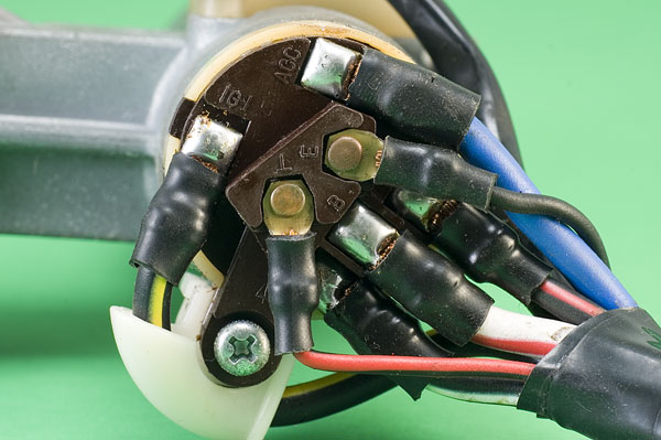 This is the schematic from the manual. Imagine the red arm (Battery) being turned by the key and each position connects it to zero, one or more of the other connectors: