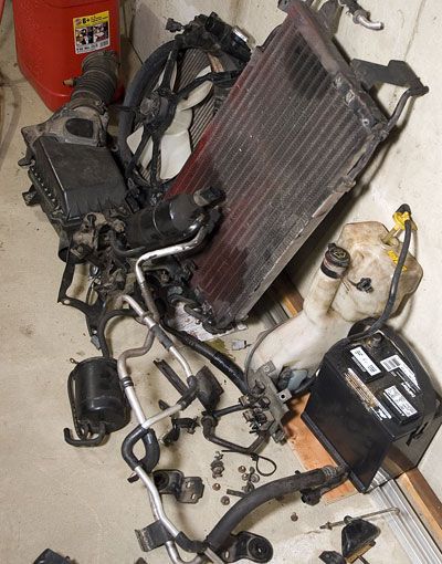 The photo shows the growing pile of parts removed from Eve over the past two days. Hopefully in a day or two the engine will be joining it.